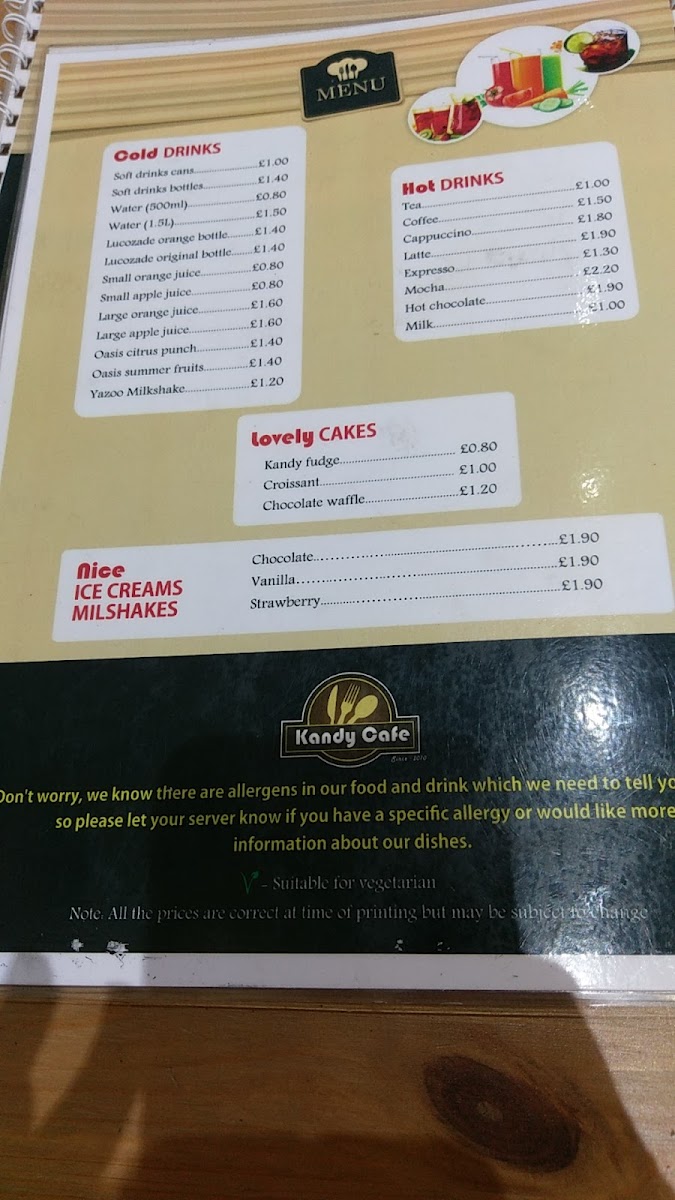 Kandy Cafe serves a diverse menu that caters to all taste buds, featuring a delectable range of drinks and pastries. For those looking to quench their thirst, the cold drink selection includes everything from fizzy favorites like Lucozade to refreshing juices. The hot drink offerings are nothing short of perfection, including freshly brewed cappuccinos and creamy lattes that will make you savor every sip.